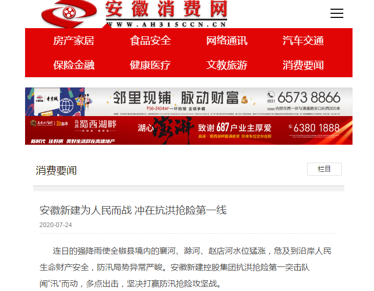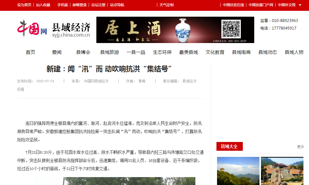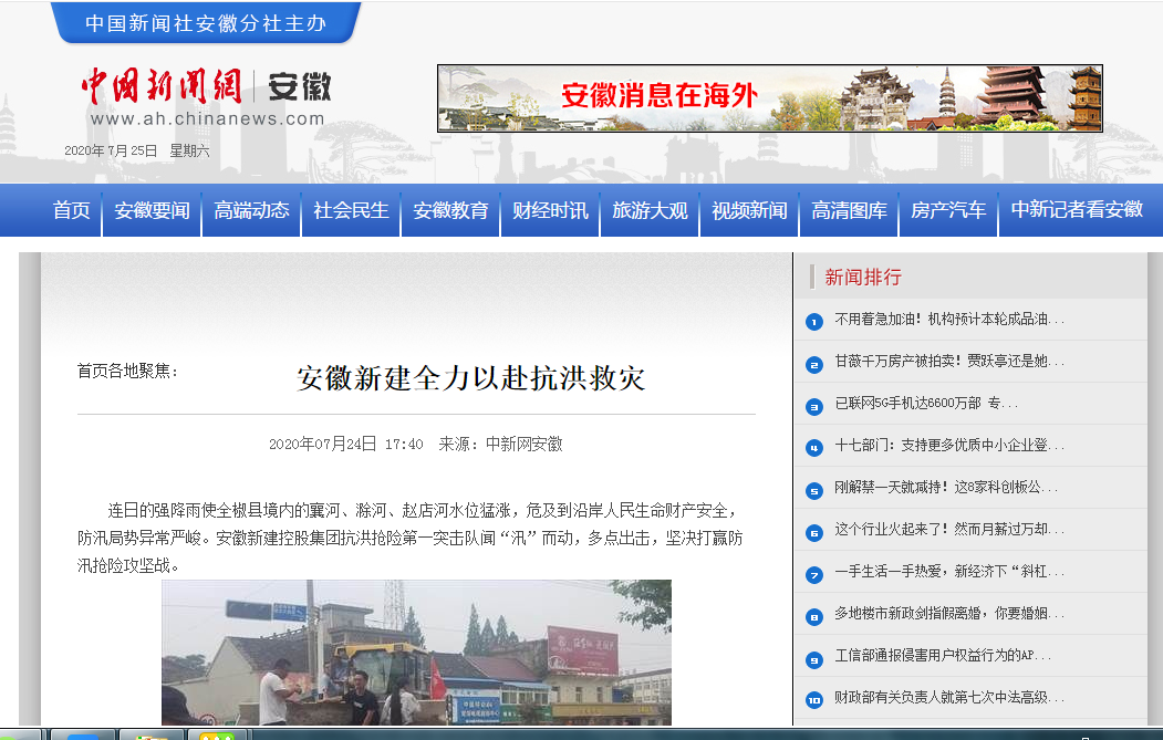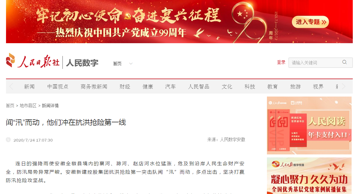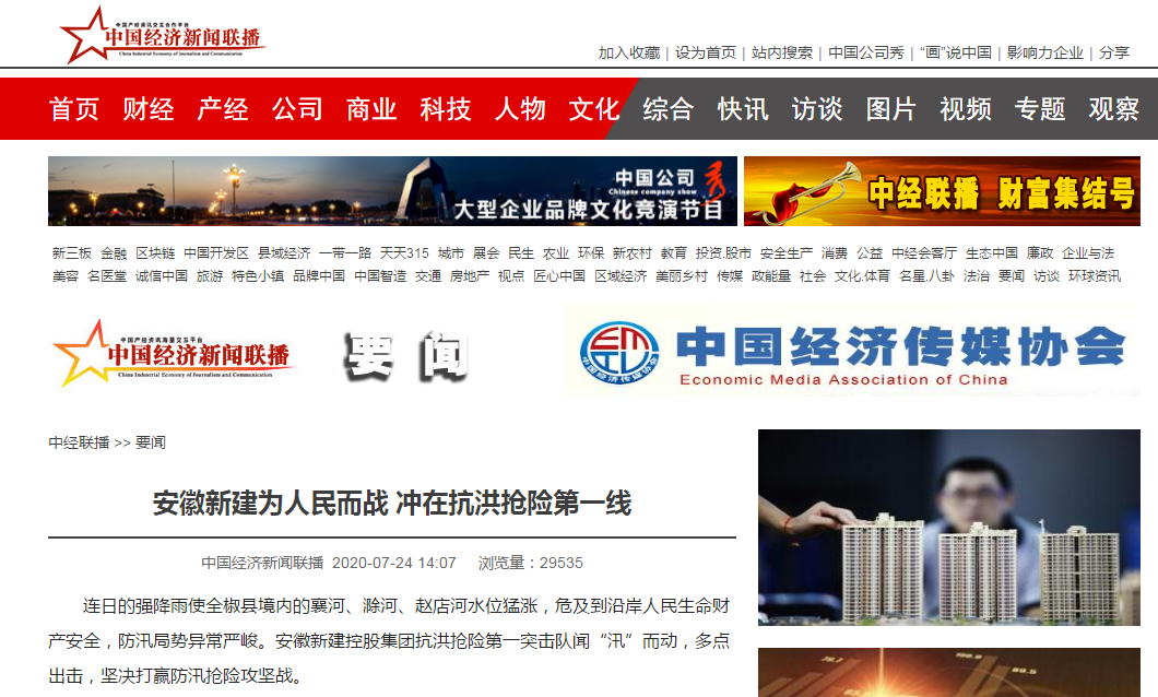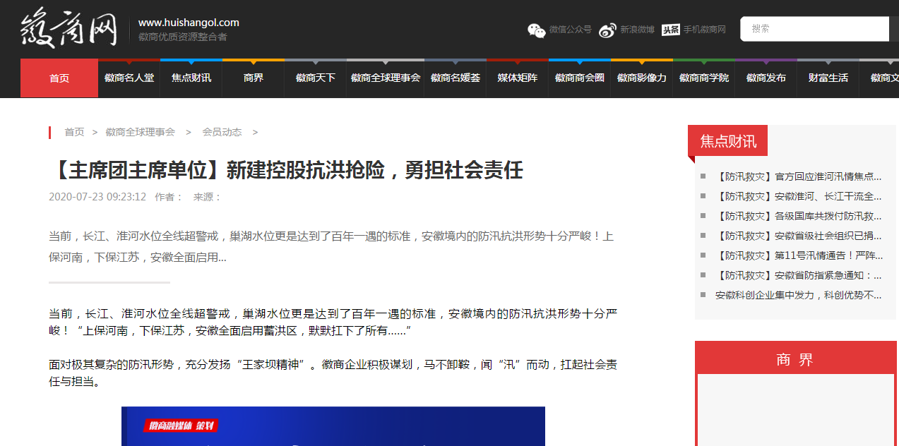 近日,安徽新建控股集團(tuán)組織動(dòng)員骨干力量踴躍參加抗洪搶險(xiǎn)的事跡,先后被人民日報(bào)數(shù)字安徽網(wǎng)、中國新聞網(wǎng)、中國網(wǎng)、中國經(jīng)濟(jì)新聞聯(lián)播網(wǎng)、徽商網(wǎng)、安徽消費(fèi)網(wǎng)等各級媒體刊發(fā),充分展示了安徽新建人的社會(huì)責(zé)任與擔(dān)當(dāng),極大鼓舞了全公司廣大員工的士氣。