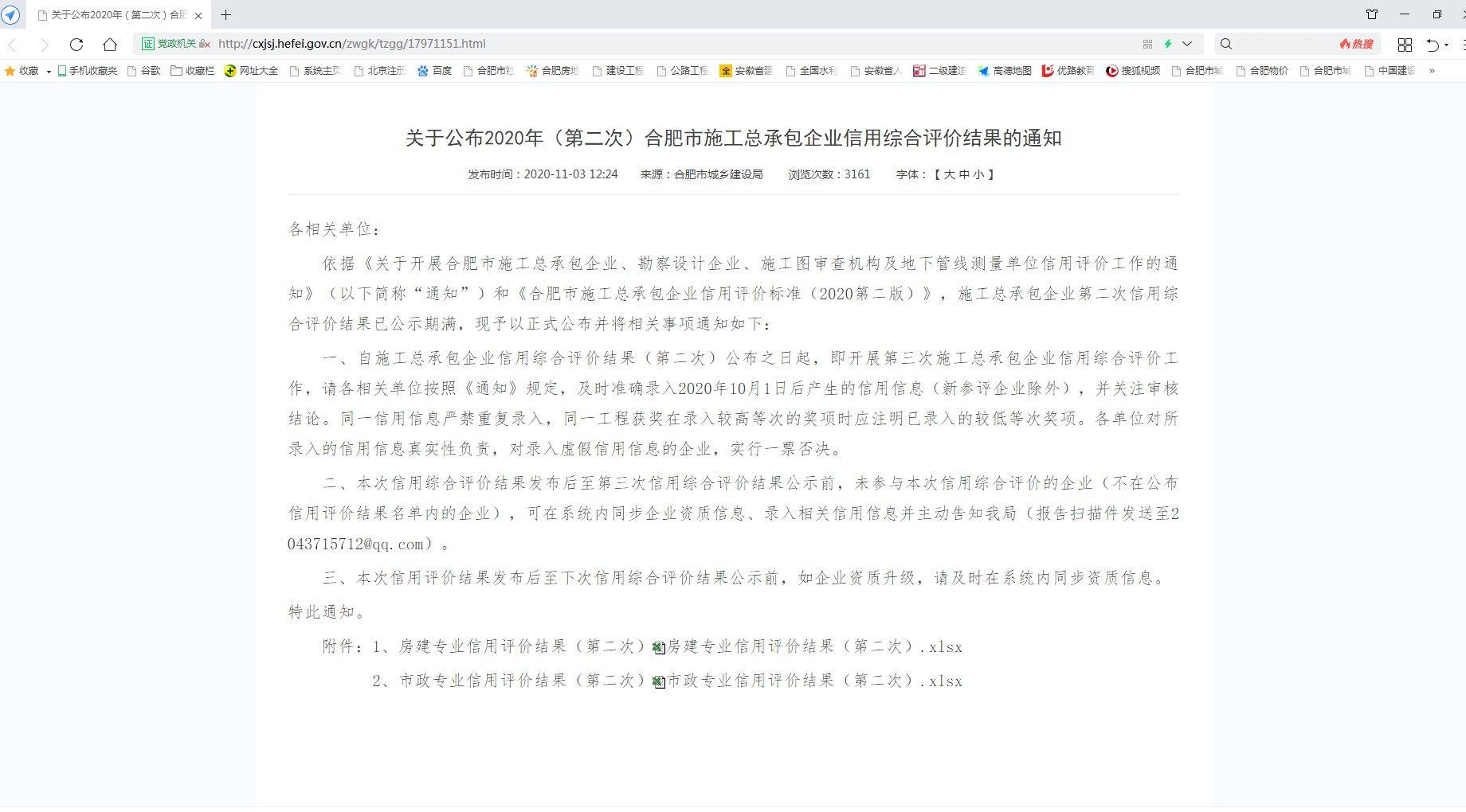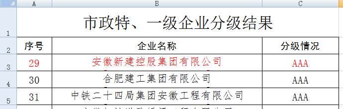 合肥市城鄉(xiāng)建設(shè)局依據(jù)《關(guān)于開展合肥市施工總承包企業(yè)、勘察設(shè)計企業(yè)、施工圖審查機構(gòu)及地下管線測量單位信用評價工作的通知》和《合肥市施工總承包企業(yè)信用評價標(biāo)準(zhǔn)(2020第二版)》,合肥市城鄉(xiāng)建設(shè)局2020年(第二次)合肥市施工總承包企業(yè)信用綜合評價結(jié)果正式公布。安徽新建控股集團有限公司榜上有名,榮獲2020 年(第二次)合肥市政專業(yè)3A級信用評級!