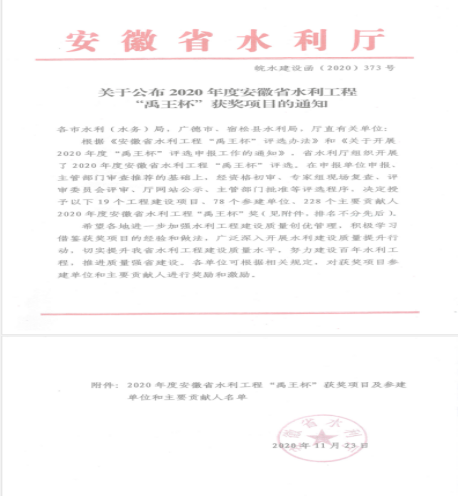 近日,根據(jù)《安徽省水利工程“禹王杯”評選辦法》和《關(guān)于開展2020年度“禹王杯”評選申報(bào)工作的通知》,在省水利廳組織開展的評選活動中,經(jīng)資格初審、專家組現(xiàn)場復(fù)查、評審委員會評審、公示,主管部門批準(zhǔn)等程序,由安徽新建控股集團(tuán)有限公司施工的“黃山風(fēng)景區(qū)麻川河丹井口至洗藥橋段防洪治理工程施工2標(biāo)”工程脫穎而出,被安徽省水利廳綜合評定為“2020年度安徽省水利工程‘禹王杯’獎”!