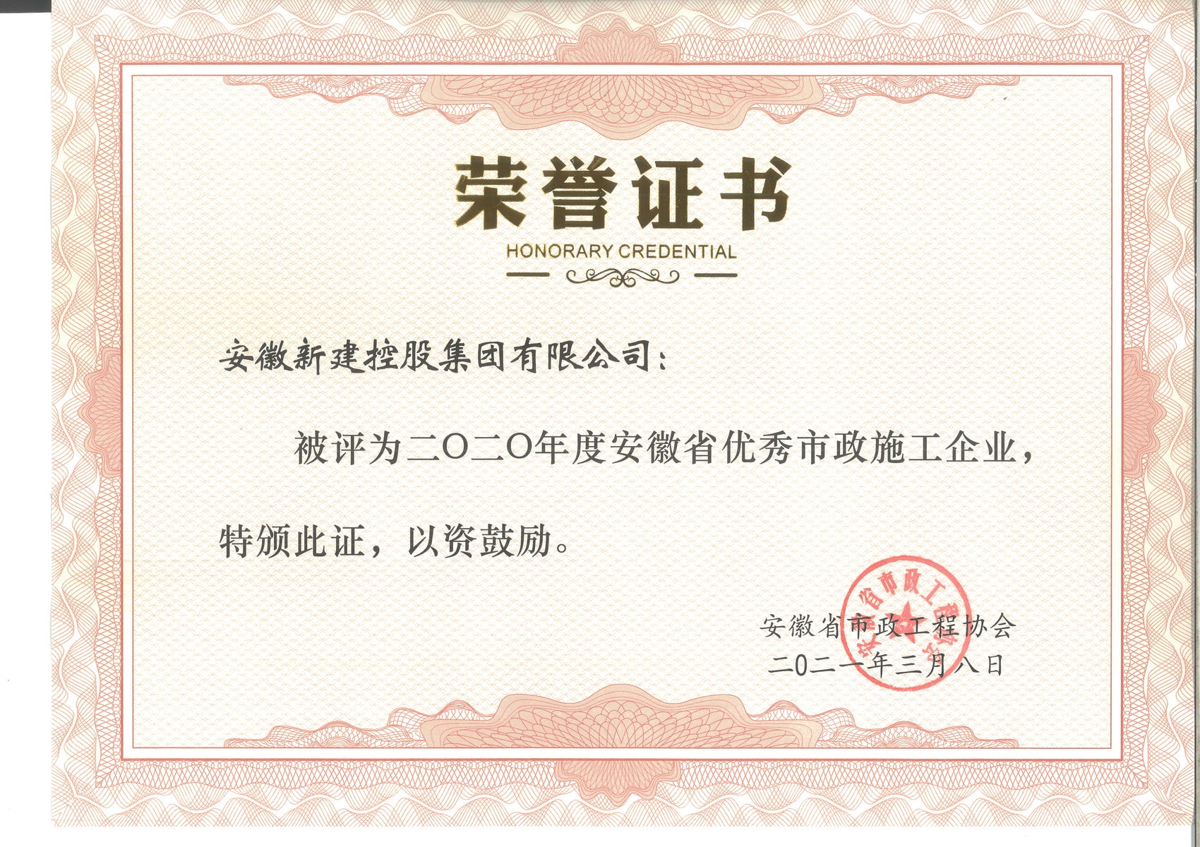 安徽新建控股集團(tuán)有限公司榮獲2020年度“安徽省優(yōu)秀市政施工企業(yè)”榮譽(yù)稱號。