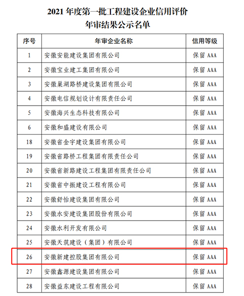 近日,中國施工企業(yè)管理協(xié)會發(fā)布關(guān)于2021年度第一批工程建設(shè)企業(yè)信用評價結(jié)果的公示,安徽新建控股集團有限公司憑借良好的生產(chǎn)經(jīng)營業(yè)績、健全的管理體系以及規(guī)范的誠信建設(shè)成果,順利通過2021年社會信用評價“AAA”級年審認(rèn)定。