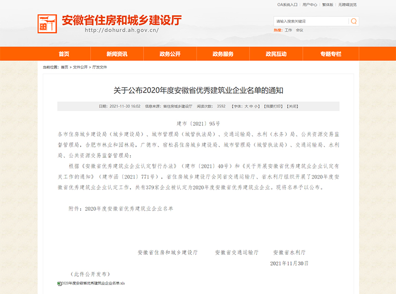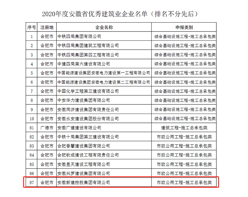 11月30日,安徽省住房和城鄉(xiāng)建設(shè)廳網(wǎng)站發(fā)布《關(guān)于公布2020年度安徽省優(yōu)秀建筑業(yè)企業(yè)名單的通知》,安徽新建控股集團(tuán)獲評“2020年度安徽省優(yōu)秀建筑業(yè)企業(yè)”,殊榮實(shí)至名歸!成績可喜可賀!