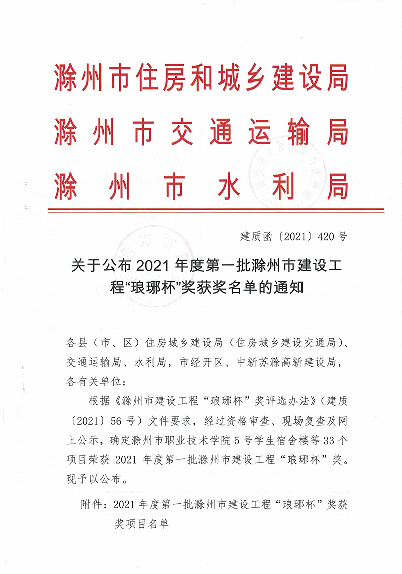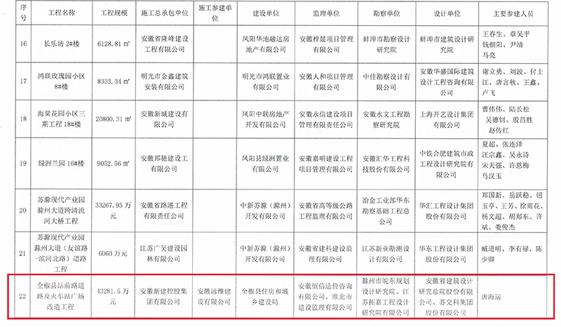 12月22日,安徽省滁州市住房和城鄉(xiāng)建設局、交通運輸局、水利局聯(lián)合印發(fā)《關于公布2021年度第一批滁州市建設工程“瑯琊杯”獲獎名單的通知》,安徽新建控股集團承建的全椒縣站前路道路及火車站廣場改造工程榜上有名。
