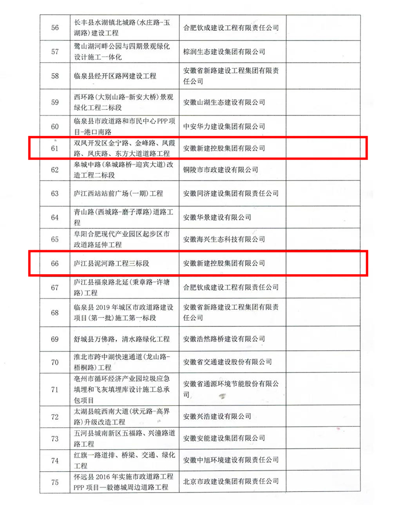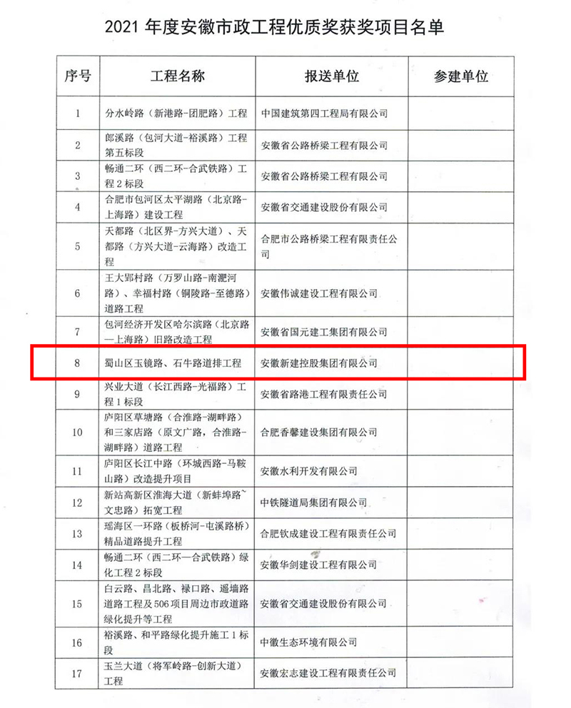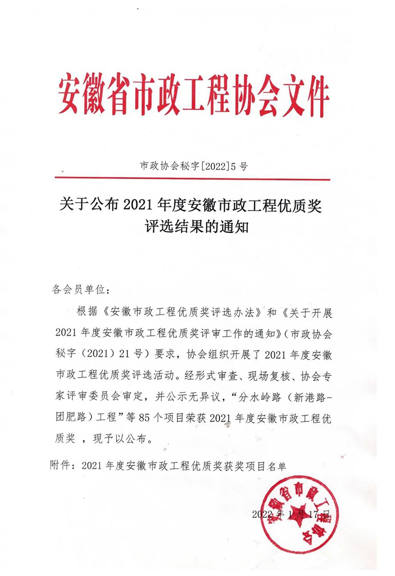 2022年1月17日,安徽省市政工程協(xié)會公布了2021年度安徽省市政工程優(yōu)質(zhì)獎評選結(jié)果的通知,經(jīng)形式審查、現(xiàn)場復核、協(xié)會專家評審委員會審定,并公示無異議,安徽新建控股集團有限公司承建的四項工程榮獲“2020年度安徽省市政工程優(yōu)質(zhì)獎”!