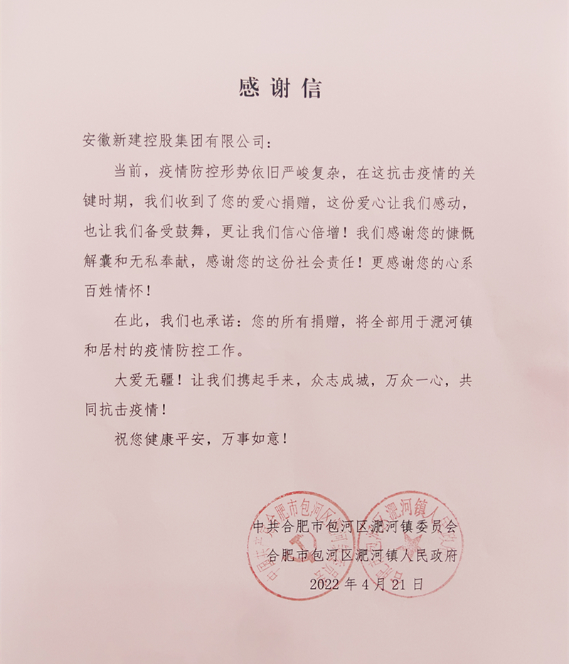 活動結(jié)束后,淝河鎮(zhèn)黨委、淝河鎮(zhèn)人民政府向集團(tuán)公司發(fā)來感謝信。感謝信內(nèi)容如下: