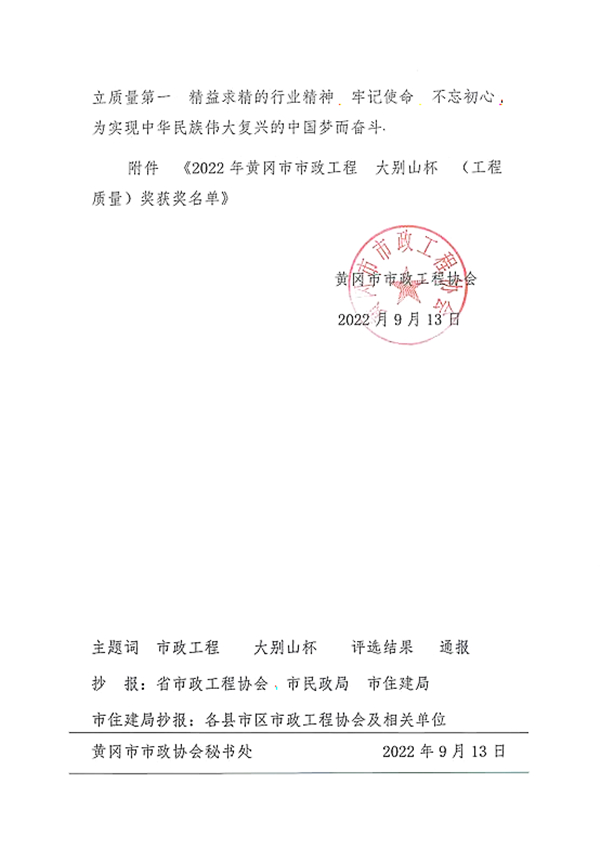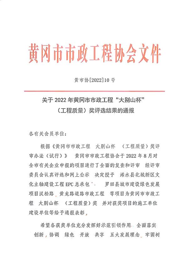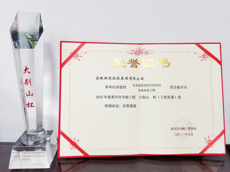 近日,黃岡市市政工程協(xié)會發(fā)布2022年度黃岡市市政工程(大別山杯)表彰名單,集團公司承建的紅安縣園藝河片區(qū)雨污分流改造工程被評為2022年度黃岡市市政工程大別山杯(工程質(zhì)量獎)。