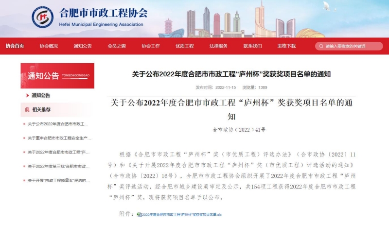 11月15日,合肥市市政工程協(xié)會網(wǎng)站發(fā)布《關(guān)于公布2022年度合肥市市政工程“廬州杯”獎(jiǎng)獲獎(jiǎng)項(xiàng)目名單的通知》,安徽新建承建三項(xiàng)市政工程喜獲2022年度合肥市市政工程“廬州杯”獎(jiǎng)。
