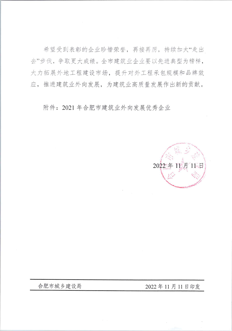 通報(bào)表彰了安徽新建在2021年克服疫情影響,大力開(kāi)拓市場(chǎng),攻堅(jiān)克難、砥礪奮進(jìn),為合肥市經(jīng)濟(jì)社會(huì)發(fā)展作出了貢獻(xiàn)。