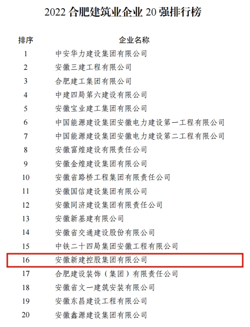 2022年12月8日,合肥市企業(yè)(企業(yè)家)聯(lián)合會頒布合肥建筑業(yè)企業(yè)20強(qiáng)榜單(排序以2021年度營業(yè)收入為準(zhǔn)),安徽新建控股集團(tuán)再次榜上有名,榮登2022合肥建筑業(yè)企業(yè)20強(qiáng)排行榜第16位。