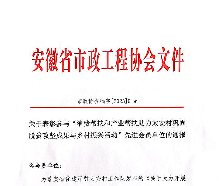 近日,安徽省市政工程協(xié)會發(fā)布關于表彰參與“消費幫扶和產(chǎn)業(yè)幫扶助力太安村鞏固脫貧攻堅成果與鄉(xiāng)村振興活動”先進會員單位的通報。表彰安徽新建控股集團在內(nèi)的三百家企業(yè),積極參與了太安村鞏固脫貧攻堅成果與鄉(xiāng)村振興活動,以實際行動履行社會責任。