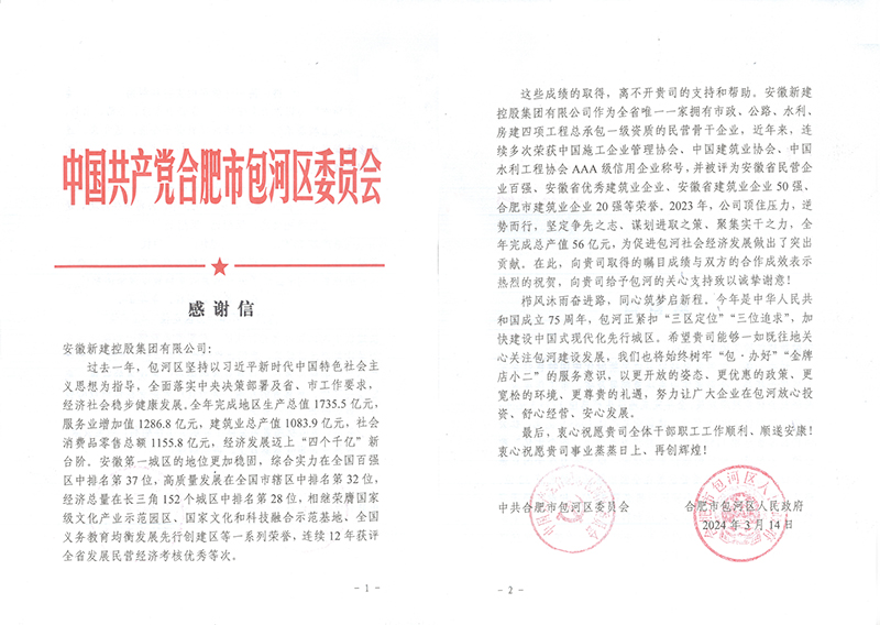 信中指出,過去一年,包河區(qū)建筑業(yè)總產(chǎn)值1083.9億元,經(jīng)濟發(fā)展邁上“四個千億”新臺階。成績?nèi)〉?,離不開集團公司的支持和幫助。安徽新建控股集團有限公司作為全省唯-一家擁有市政、公路、水利、房建四項工程總承包一級資質(zhì)的民營骨干企業(yè),近年來,連續(xù)多次榮獲中國施工企業(yè)管理協(xié)會、中國建筑業(yè)協(xié)會、中國水利工程協(xié)會AAA級信用企業(yè)稱號,并被評為安徽省民營企業(yè)百強、安徽省優(yōu)秀建筑業(yè)企業(yè)、安徽省建筑業(yè)企業(yè)50強合肥市建筑業(yè)企業(yè)20強等榮譽。2023年,公司頂住壓力,逆勢而行,堅定爭先之志、謀劃進取之策、聚集實干之力,全年完成總產(chǎn)值56億元,為促進包河社會經(jīng)濟發(fā)展做出了突出貢獻。