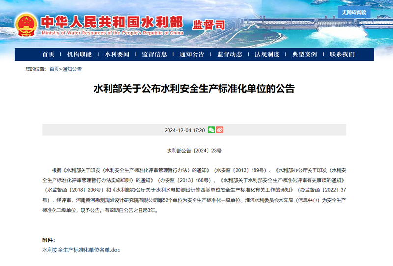 12月4日,水利部發(fā)布《關(guān)于公布水利安全生產(chǎn)標(biāo)準(zhǔn)化單位的公告》,經(jīng)評(píng)審,集團(tuán)公司獲評(píng)水利安全生產(chǎn)標(biāo)準(zhǔn)化一級(jí)單位。該等級(jí)是體現(xiàn)水利生產(chǎn)經(jīng)營(yíng)單位安全生產(chǎn)管理水平的重要標(biāo)志,并作為業(yè)績(jī)考核、行業(yè)表彰、信用評(píng)級(jí)以及評(píng)價(jià)水利生產(chǎn)經(jīng)營(yíng)單位參與水利市場(chǎng)競(jìng)爭(zhēng)能力的重要參考依據(jù)。