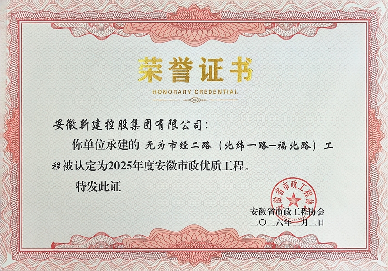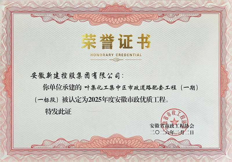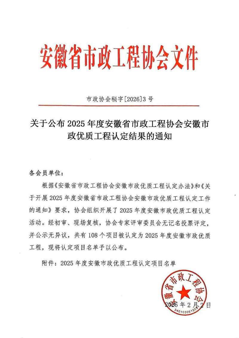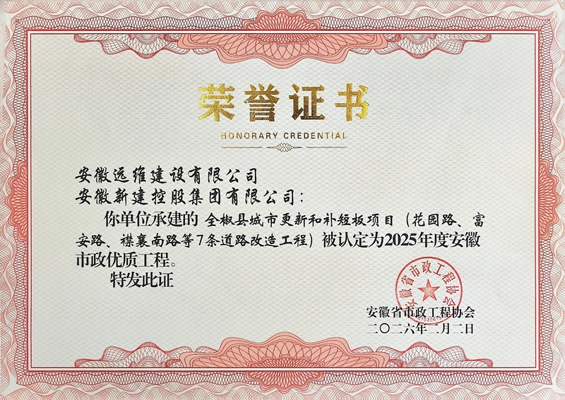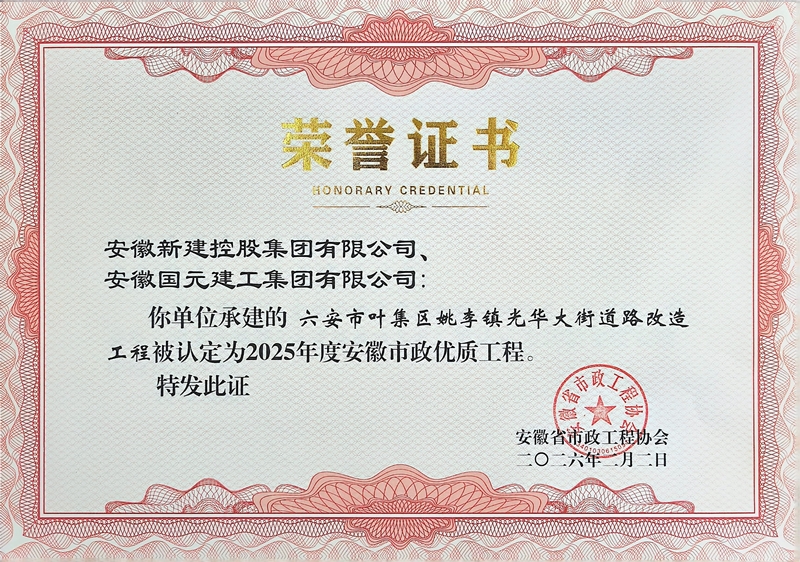2月2日,安徽省市政工程協(xié)會公布2025年度安徽市政優(yōu)質(zhì)工程項目名單,集團公司承建的四項工程榮獲獎項,分別是:六安市葉集區(qū)姚李鎮(zhèn)光華大街道路改造工程、全椒縣城市更新和補短板項目、葉集化工集中區(qū)市政道路配套工程、無為市經(jīng)二路工程。