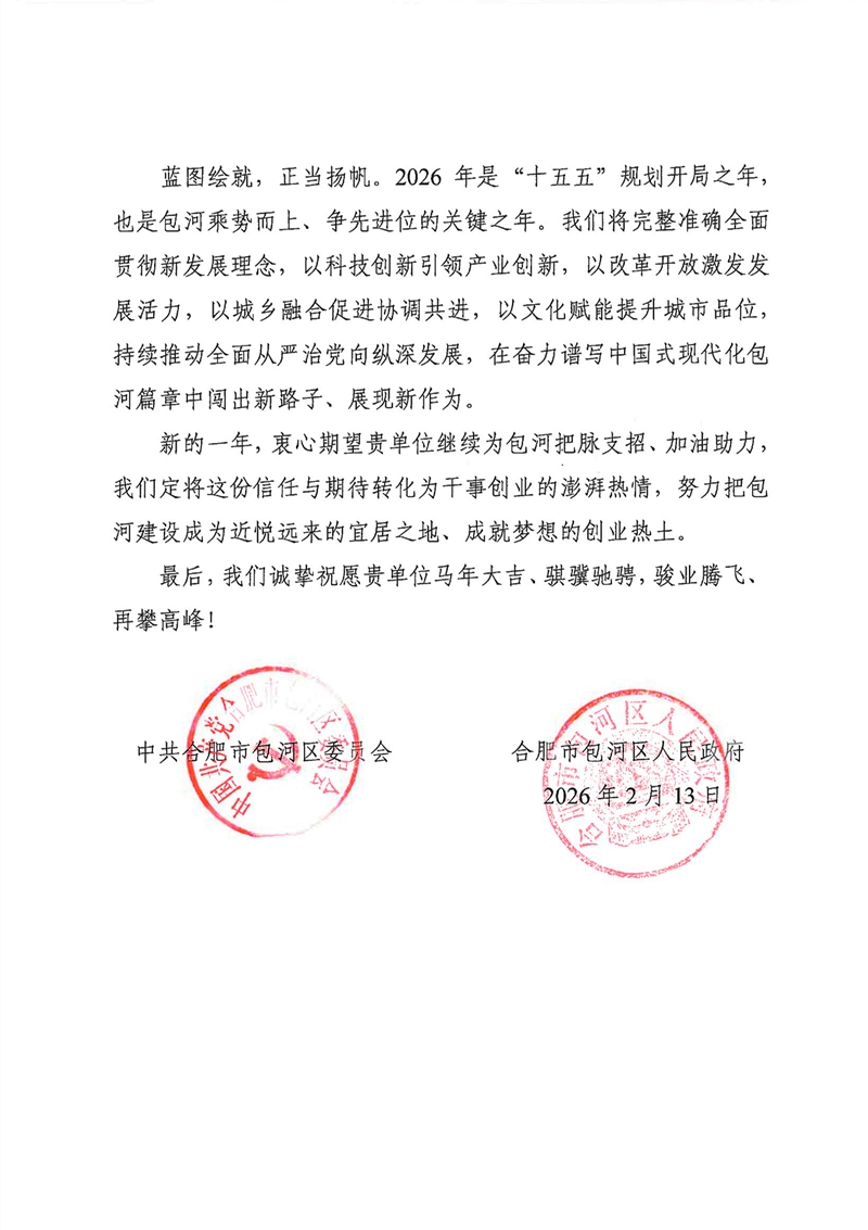 近日,安徽新建控股集團(tuán)收到合肥市包河區(qū)委、區(qū)政府新春感謝信,信中致謝公司對包河發(fā)展的鼎力支持,并致以新春祝福。2025年包河成為全省首個“兩千億”城區(qū),全國百強(qiáng)區(qū)排名升至35位,發(fā)展成果離不開公司助力。2026年作為“十五五”開局之年,包河期待公司繼續(xù)賦能發(fā)展。集團(tuán)公司將不負(fù)信任,深耕包河、主動作為,與包河同頻共振,共推高質(zhì)量發(fā)展再上新臺階,攜手繪就發(fā)展新圖景。