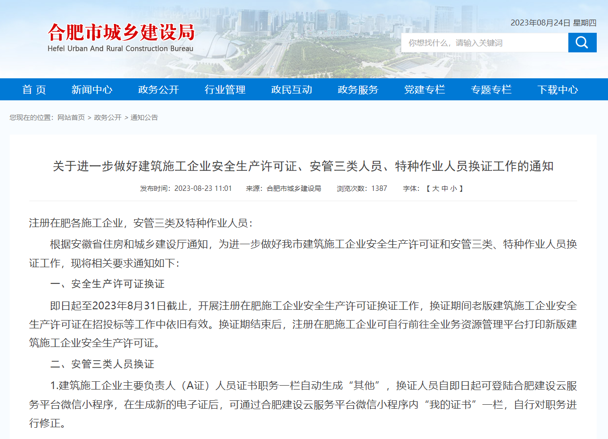 即日起至2023年8月31日截止,開展注冊在肥施工企業(yè)安全生產(chǎn)許可證換證工作,換證期間老版建筑施工企業(yè)安全生產(chǎn)許可證在招投標等工作中依舊有效。換證期結(jié)束后,注冊在肥施工企業(yè)可自行前往全業(yè)務(wù)資源管理平臺打印新版建筑施工企業(yè)安全生產(chǎn)許可證。