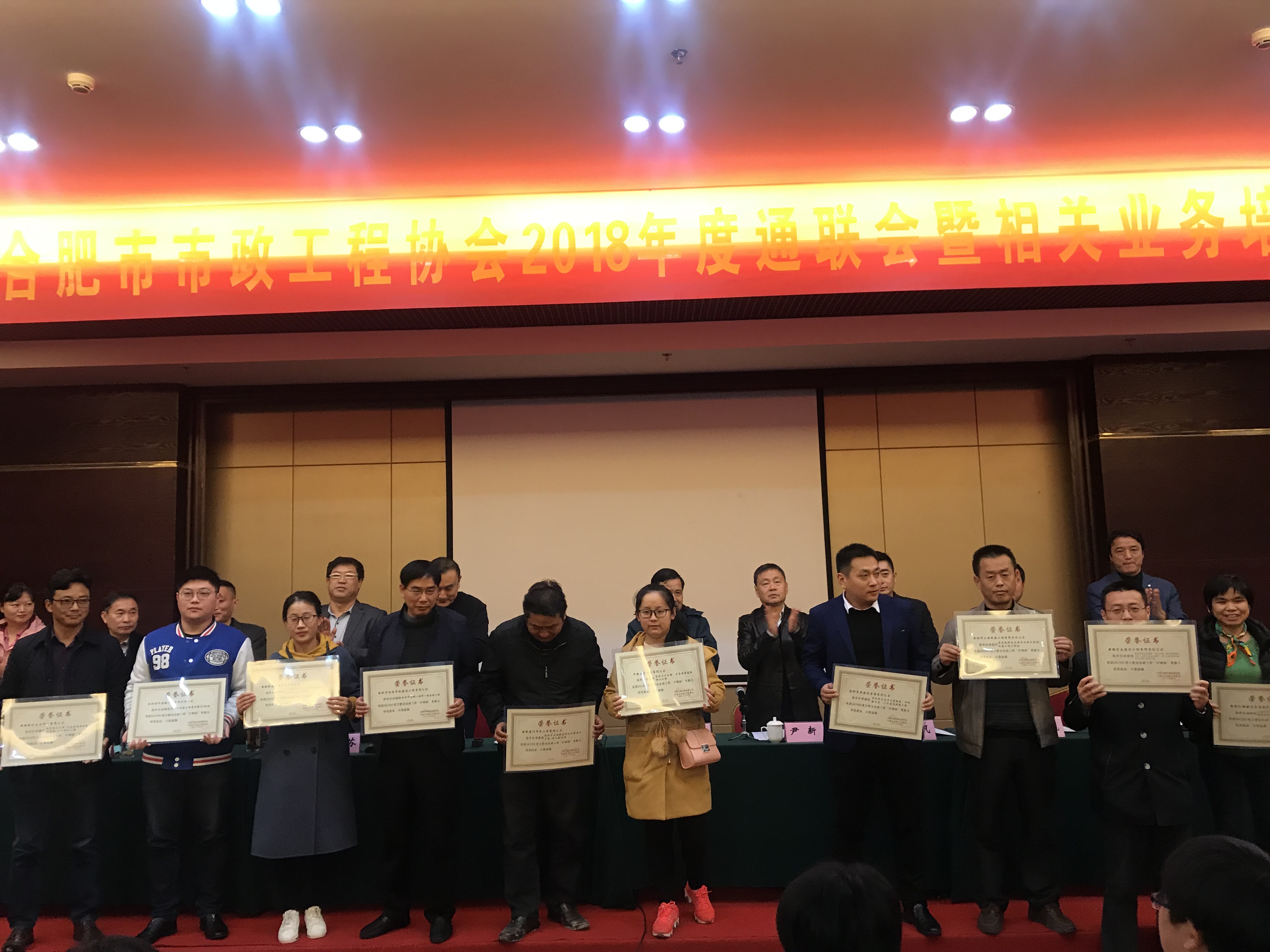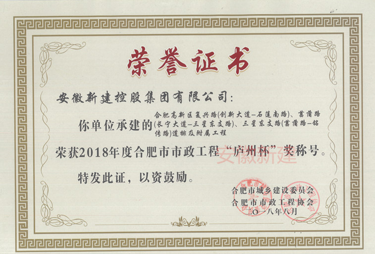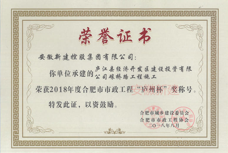 近日,合肥市市政工程協(xié)會舉辦了2018年度聯(lián)通會暨相關(guān)業(yè)務(wù)培訓(xùn),會議表彰了2018年度合肥市市政工程“廬州杯”獎,并現(xiàn)場頒發(fā)了獎項。由我公司承建的合肥高新區(qū)復(fù)興路(創(chuàng)新大道-石蓮南路)、菖蒲路(長寧大道-三星東支路)、三星東支路(當(dāng)蒲路-銘傳路)道排及附屬工程與廬江縣經(jīng)濟(jì)開發(fā)區(qū)建設(shè)投資有限公司磙橋路工程施工獲此殊榮。