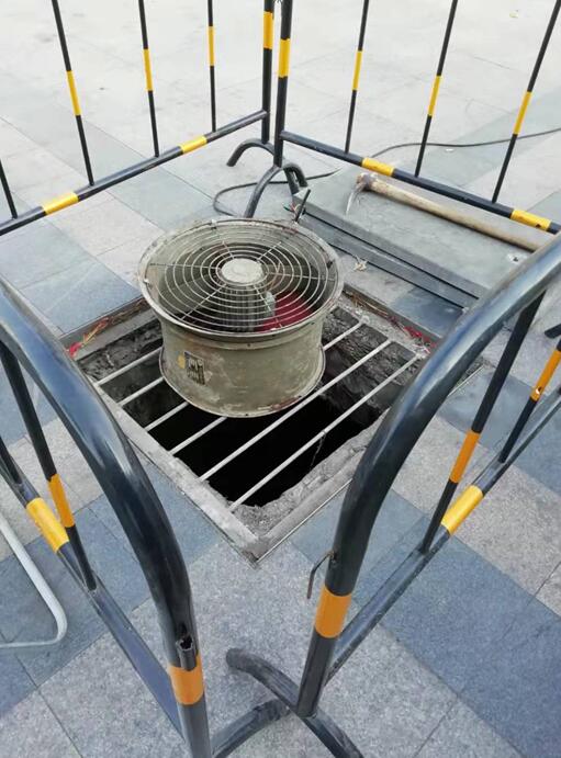 1、進(jìn)入暗渠作業(yè)前,提前1小時(shí)采用軸流風(fēng)機(jī)強(qiáng)制通風(fēng),把新鮮的空氣通過檢查井送至工作地點(diǎn),把原箱涵里面可能存在的有害氣體排干凈。如下圖: