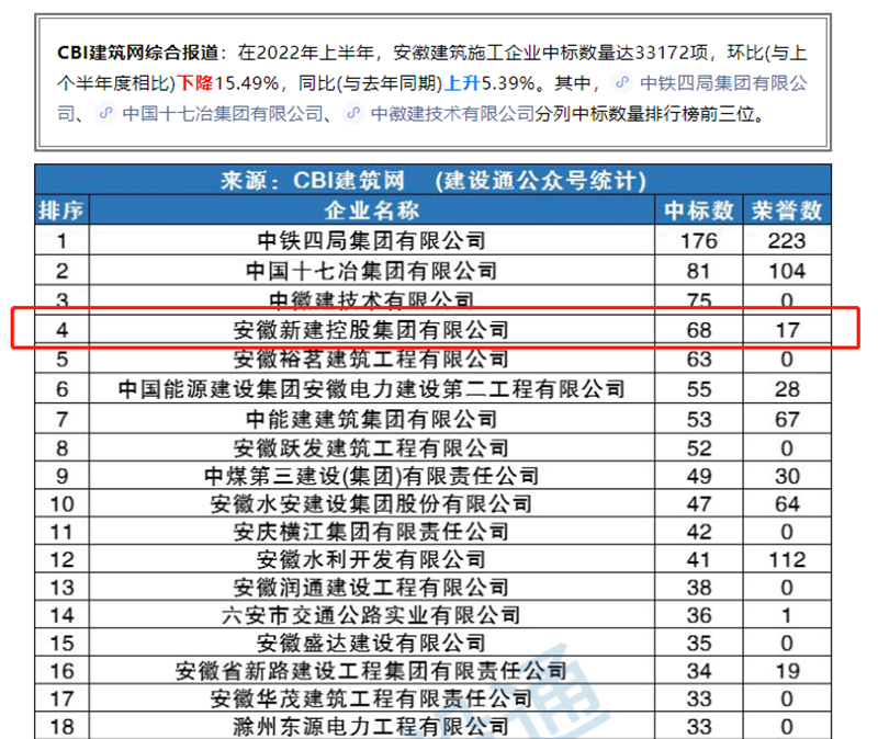7月20日,CBI建筑網(wǎng)綜合報道發(fā)布《安徽2022上半年建企中標(biāo)100強》,在2022年上半年,安徽建筑施工企業(yè)中標(biāo)數(shù)量達33172項,環(huán)比(與上個半年度相比)下降15.49%,同比(與去年同期)上升5.39%。其中安徽新建控股集團有限公司位列中標(biāo)數(shù)量排行榜第四,穩(wěn)居前位。