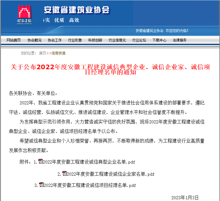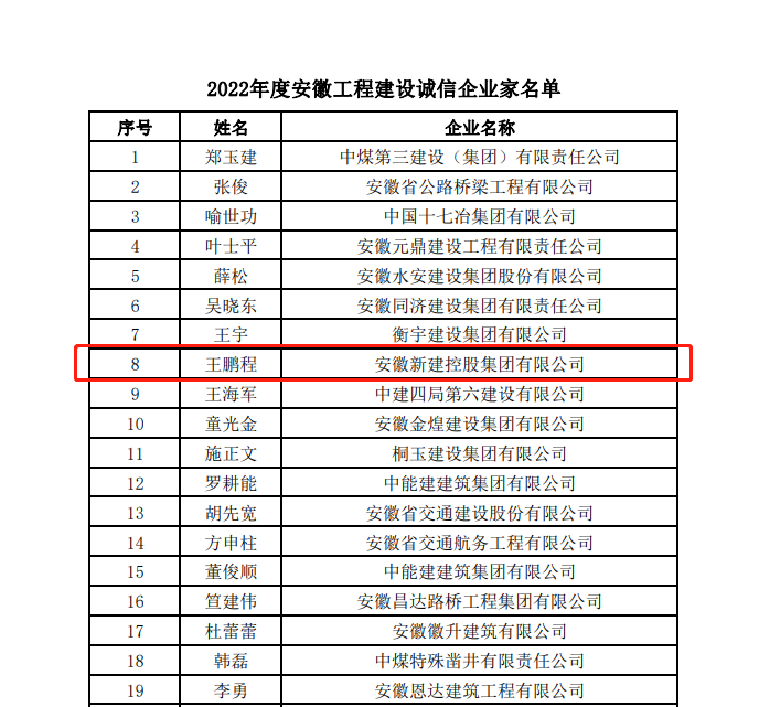 1月3日,安徽建筑業(yè)協(xié)會官網(wǎng)發(fā)布2022年度安徽工程建設(shè)誠信典型企業(yè)、誠信企業(yè)家、誠信項目經(jīng)理名單,安徽新建控股集團(tuán)榮獲“2022年度安徽工程建設(shè)誠信典型企業(yè)”,公司總經(jīng)理王鵬程獲評“誠信企業(yè)家”,唐海運、張軻、鄭理喬分獲“誠信項目經(jīng)理”稱號。