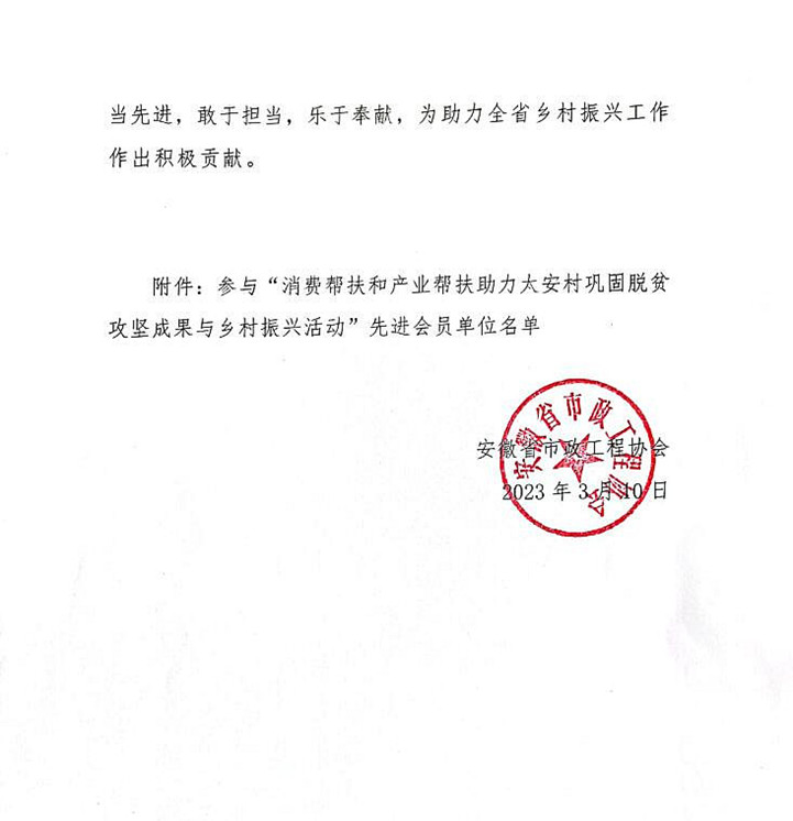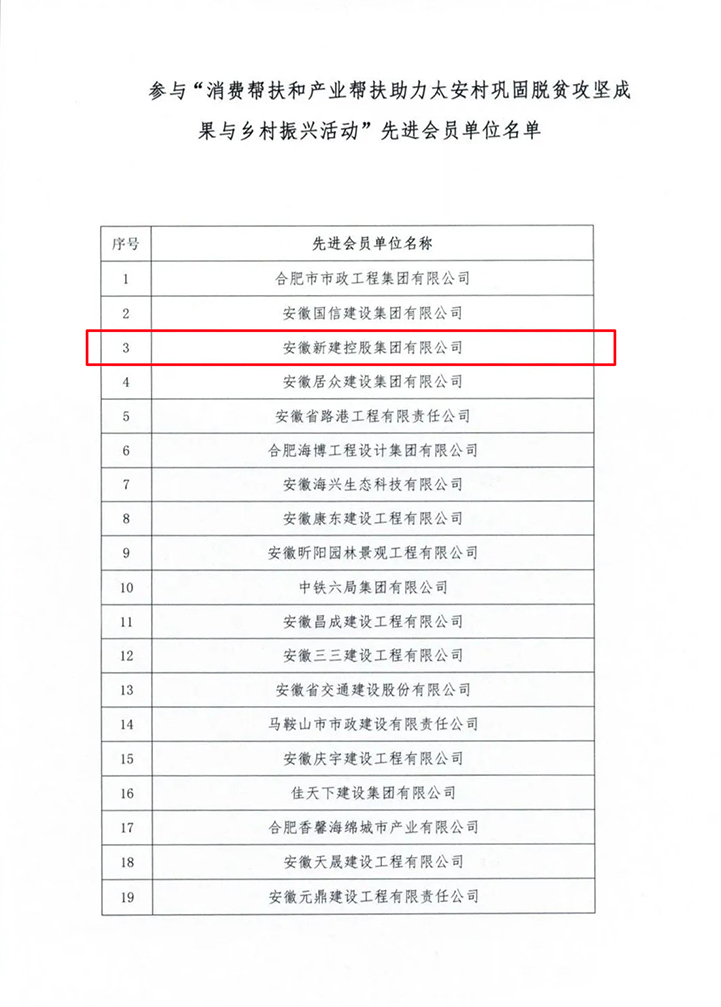 近日,安徽省市政工程協(xié)會發(fā)布關于表彰參與“消費幫扶和產(chǎn)業(yè)幫扶助力太安村鞏固脫貧攻堅成果與鄉(xiāng)村振興活動”先進會員單位的通報。表彰安徽新建控股集團在內(nèi)的三百家企業(yè),積極參與了太安村鞏固脫貧攻堅成果與鄉(xiāng)村振興活動,以實際行動履行社會責任。