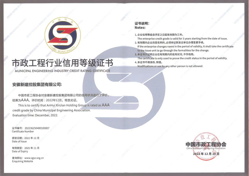 近日,中國市政工程協(xié)會頒發(fā)2022年度首批市政工程企業(yè)信用評價等級證書,安徽新建榮獲“AAA”等級。