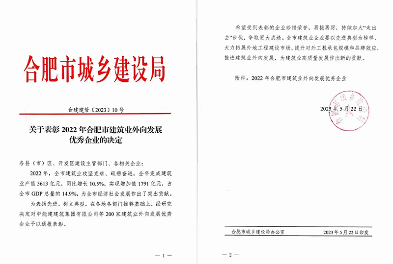 通報表彰了安徽新建作為建筑業(yè)外向發(fā)展優(yōu)秀企業(yè)之一,在2022年大力開拓市場,攻堅克難、砥礪奮進(jìn),為合肥市經(jīng)濟社會發(fā)展作出了貢獻(xiàn)。再次獲評,體現(xiàn)了上級主管部門對我公司近年來穩(wěn)定發(fā)展業(yè)績的肯定和未來發(fā)展的良好預(yù)期,也激勵了我們再創(chuàng)佳績的信心與決心。