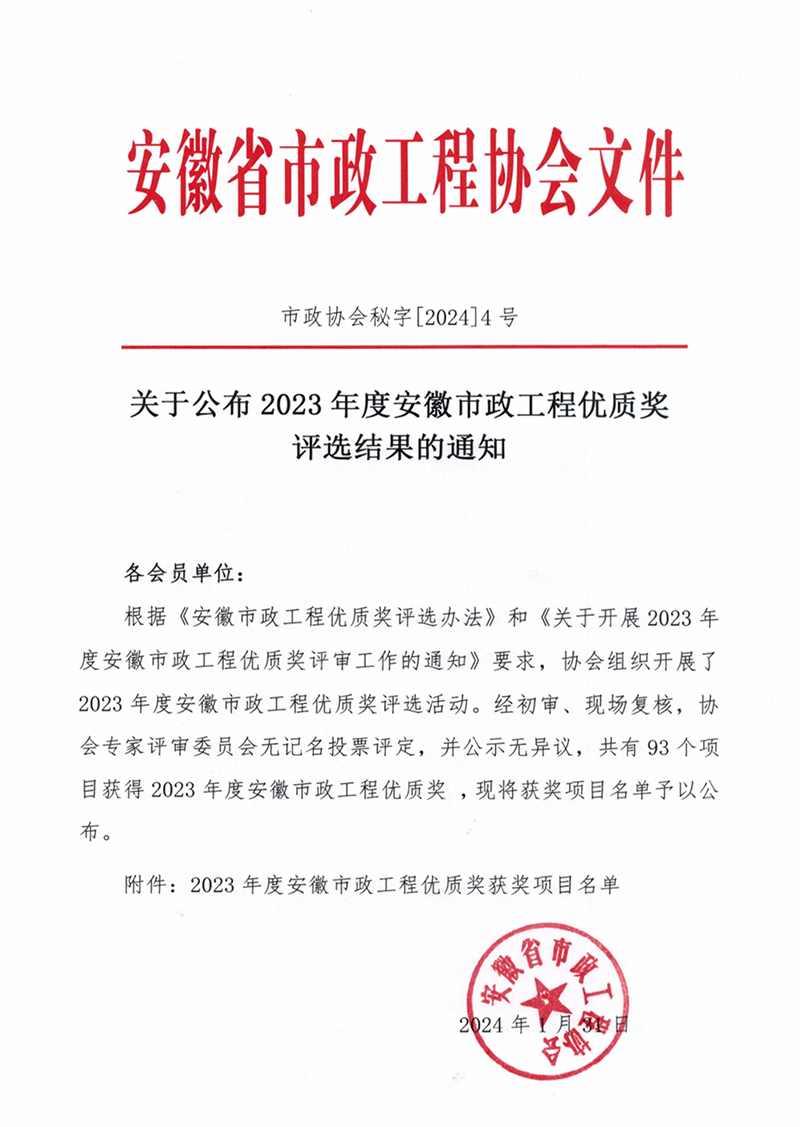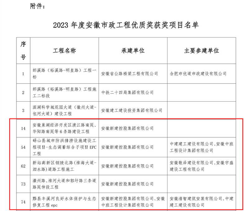 1月31日,安徽省市政工程協(xié)會(huì)公布關(guān)于“2023年度安徽省市政工程優(yōu)質(zhì)獎(jiǎng)”評(píng)選結(jié)果的通知,集團(tuán)公司承建的安徽巢湖經(jīng)濟(jì)開(kāi)發(fā)區(qū)渡江路南延、華陽(yáng)路南延等6條路建設(shè)工程、碭山縣城市防洪排澇設(shè)施建設(shè)工程項(xiàng)目-生態(tài)調(diào)蓄綜合子項(xiàng)目EPC工程、新站高新區(qū)銅陵北路(淮海大道泗水路)道路工程施工、濠州路、淮河大道和郭圩路三條道路延伸段工程、黟縣豐溪河良好水體保護(hù)與生態(tài)修復(fù)工程epc等5項(xiàng)工程榮獲2023年度安徽省市政工程優(yōu)質(zhì)獎(jiǎng)獎(jiǎng)項(xiàng)。