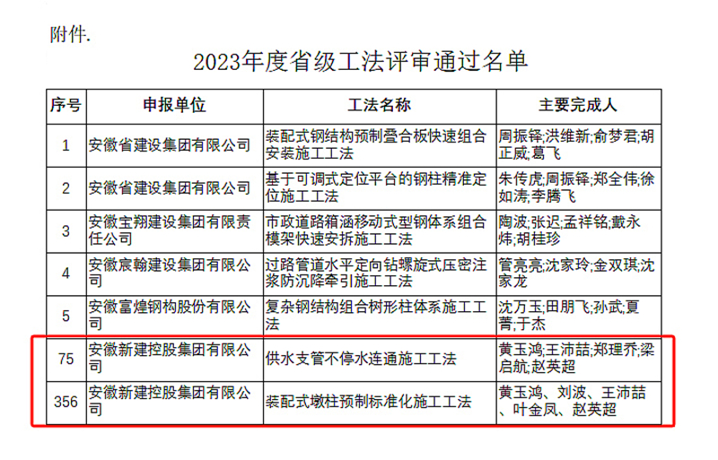 近日,安徽省住房和城鄉(xiāng)建設(shè)廳公布了2023年度省級工法名單,集團(tuán)公司申報(bào)的《裝配式梁組合封閉箍筋施工工法》、《供水支管不停水連通施工工法》等2項(xiàng)工法獲評安徽省省級工法。