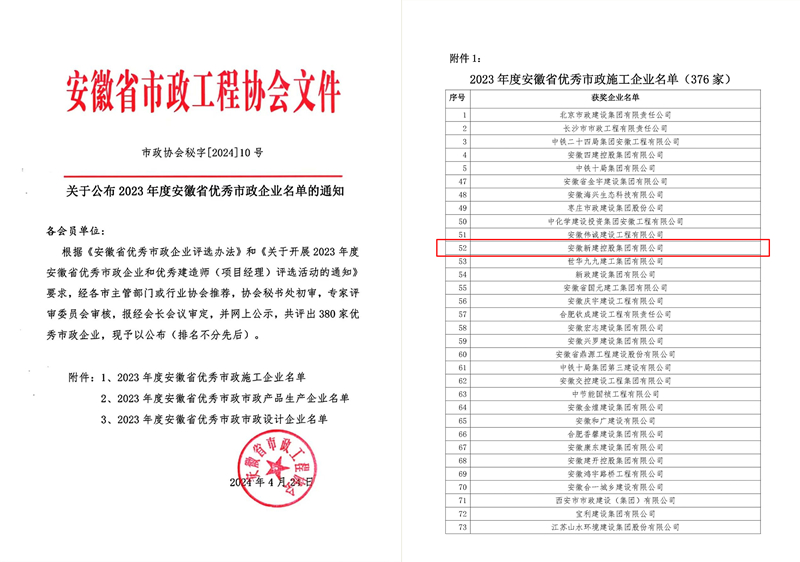 4月24日,安徽省市政工程協(xié)會(huì)發(fā)布通知,根據(jù)《安徽省優(yōu)秀市政施工企業(yè)評(píng)選辦法》和《關(guān)于開展2023年度安徽省優(yōu)秀市政施工企業(yè)和優(yōu)秀建造師(項(xiàng)目經(jīng)理)評(píng)選活動(dòng)的通知》要求,經(jīng)專家評(píng)審委員會(huì)審核通過,安徽新建控股集團(tuán)有限公司榮獲2023年度“安徽省優(yōu)秀市政施工企業(yè)”榮譽(yù)稱號(hào)。