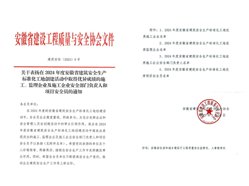 近日,安徽省建設(shè)工程質(zhì)量與安全協(xié)會(huì)發(fā)布表?yè)P(yáng)通知,集團(tuán)公司榮獲“安徽省建筑安全生產(chǎn)標(biāo)準(zhǔn)化工地優(yōu)秀施工企業(yè)”稱號(hào),公司多名安全管理人員獲得表彰。