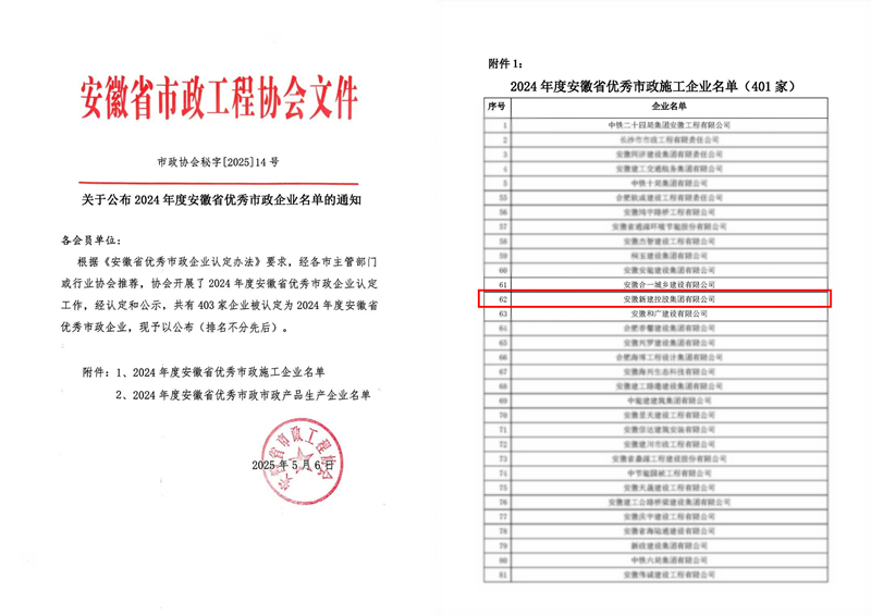 近日,安徽省市政工程協(xié)會(huì)發(fā)布通知,根據(jù)《安徽省優(yōu)秀市政施工企業(yè)認(rèn)定辦法》和《安徽省市政施工企業(yè)優(yōu)秀建造師(項(xiàng)目經(jīng)理)認(rèn)定辦法》要求,經(jīng)各市主管部門或行業(yè)協(xié)會(huì)推薦,經(jīng)認(rèn)定和公示,安徽新建控股集團(tuán)有限公司榮獲“2024年度安徽省優(yōu)秀市政施工企業(yè)”榮譽(yù)稱號(hào)。