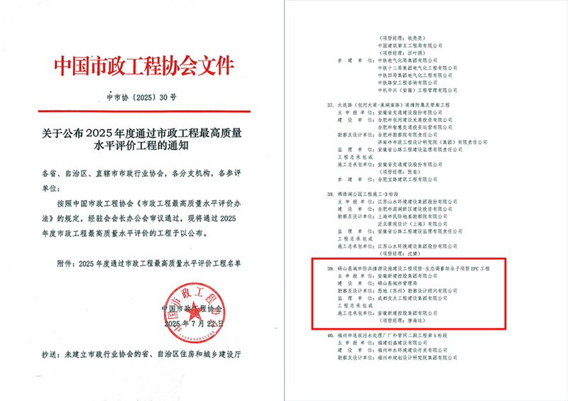 近日,中國(guó)市政工程協(xié)會(huì)發(fā)布《關(guān)于2025年度通過(guò)市政工程最高質(zhì)量水平評(píng)價(jià)工程的通知》,由集團(tuán)公司建設(shè)的碭山縣城市防洪排澇設(shè)施建設(shè)工程項(xiàng)目-生態(tài)調(diào)蓄綜合子項(xiàng)目EPC工程成功榮獲“2025年度市政工程最高質(zhì)量水平評(píng)價(jià)工程”這一市政工程行業(yè)最高榮譽(yù)。