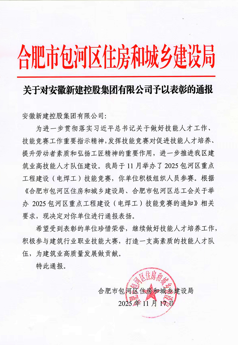 11月17日,從合肥市包河區(qū)住房和城鄉(xiāng)建設(shè)局傳來(lái)喜訊,我公司因在“2025包河區(qū)重點(diǎn)工程建設(shè)(電焊工)技能競(jìng)賽”中的出色組織和積極參與,獲得主管部門(mén)通報(bào)表?yè)P(yáng)。這一榮譽(yù)是對(duì)我公司在技能人才培養(yǎng)和高素質(zhì)隊(duì)伍建設(shè)方面工作的充分肯定。
