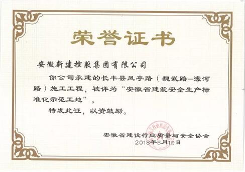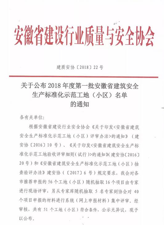 近日,安徽省建設(shè)行業(yè)質(zhì)量與安全協(xié)會(huì)公布了2018年度第一批安徽省建筑安全生產(chǎn)標(biāo)準(zhǔn)化示范工地(小區(qū))名單,由我公司承建的鳳亭路(魏武路-濛河路)項(xiàng)目榮登榜單!